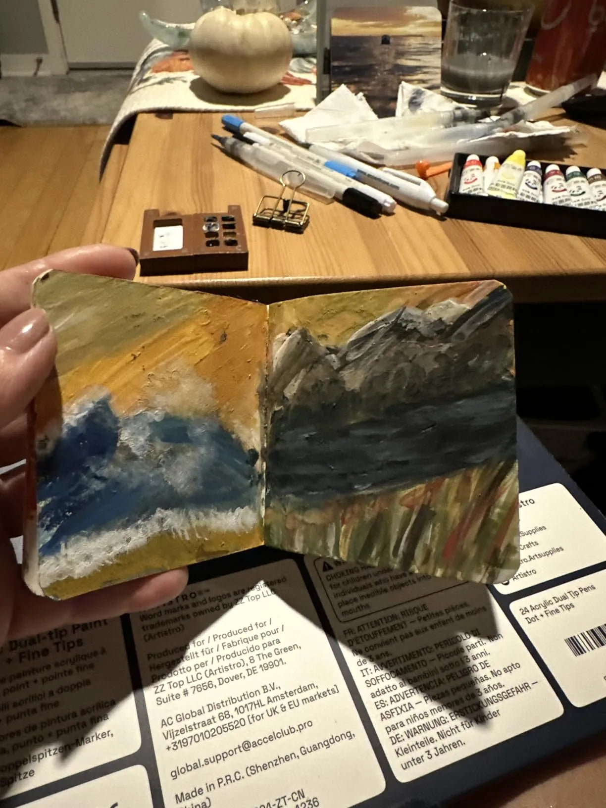 I cannot say enough about these mini books and pallets! It did take me a minute to figure out how to put the water in the pens tho lol they screw on backwards. I have literally been obsessed with painting. I'm not a great artist but I'm having so much fun trying. These wash up really well and I love the little wooden pallet. The paints are also nice. I've ordered three others for gifts. I sent my son and his girlfriend each one for their trip to Hawaii! I thought it would be fun to paint while they're on the beach. They are so small they're easy to carry! Don't laugh at my pictures I know I'm not a great artist. Lol it's so relaxing to paint!