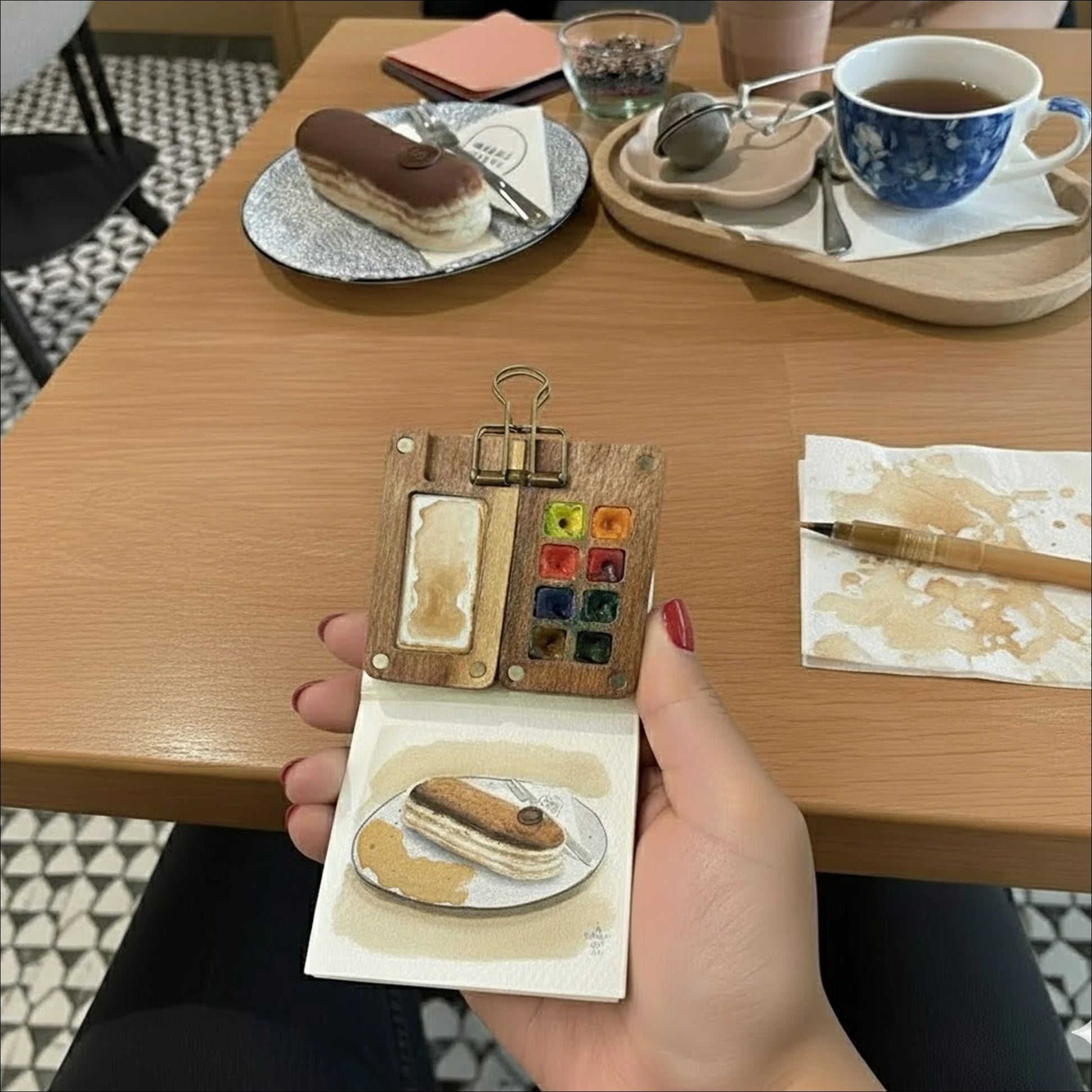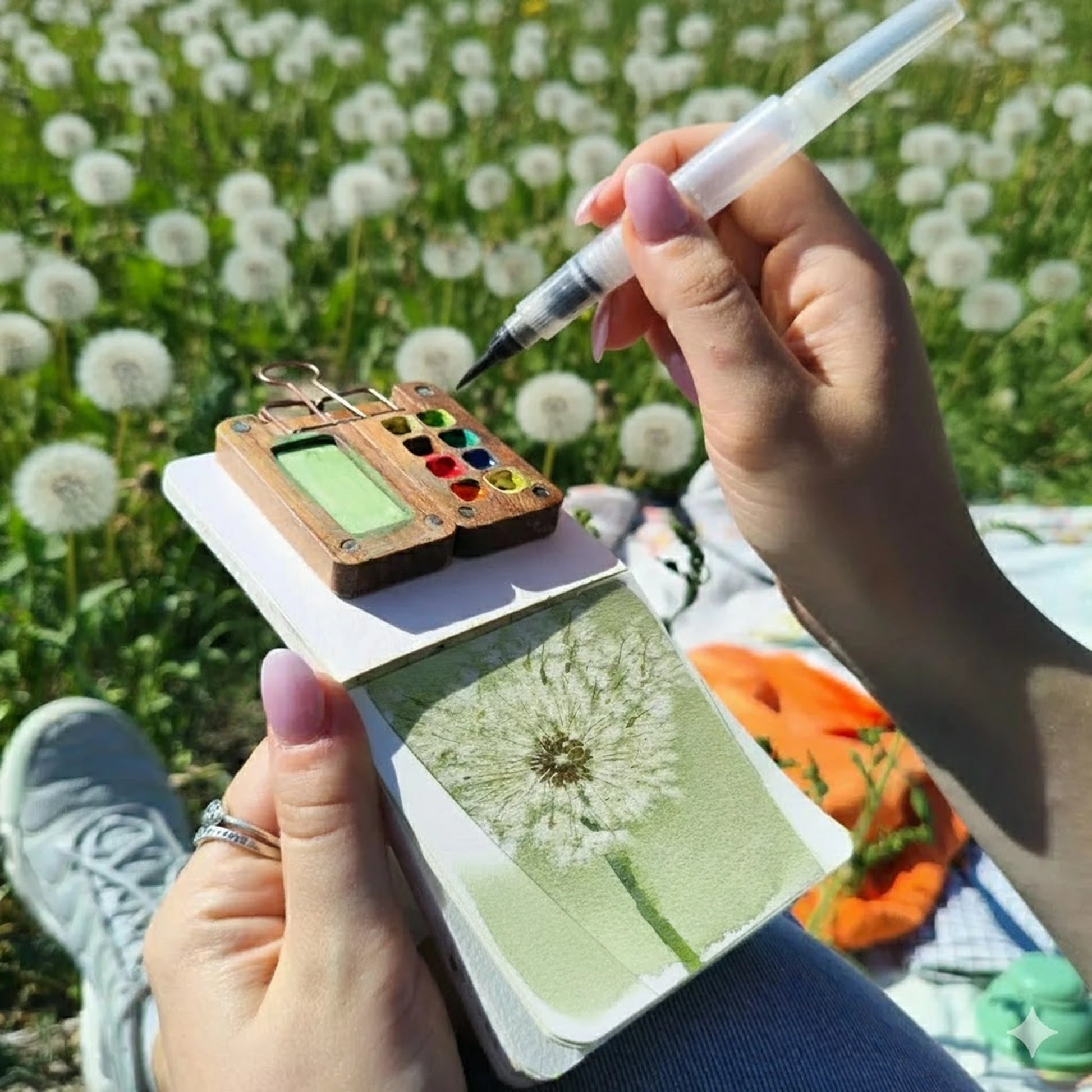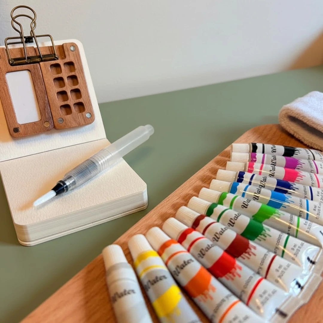 Open the walnut case, fill your pans, grab the refillable brush. Everything you need is right here. Start painting in seconds.